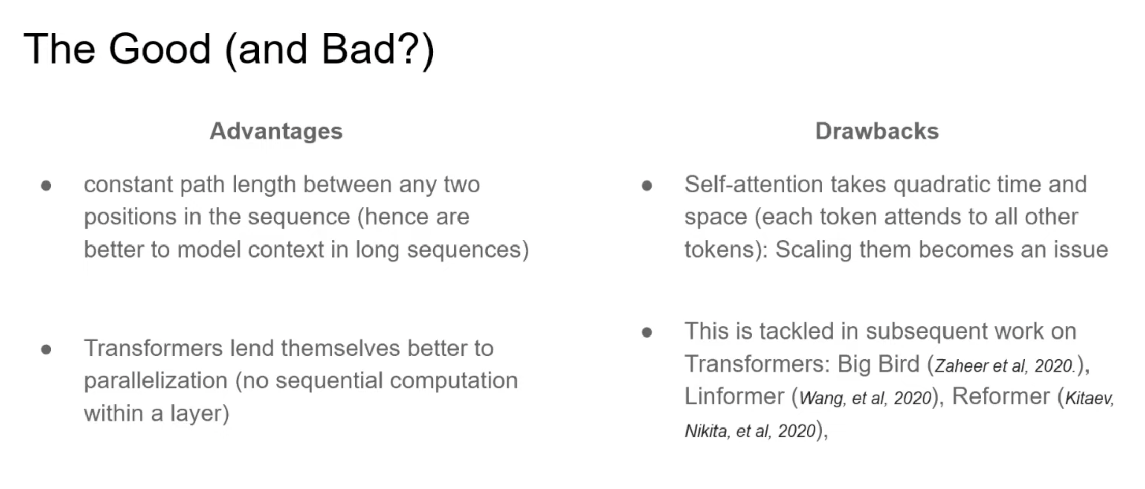 단점으로는 모든 token이 다른 모든 token과의 attention을 계산해야 하므로 quardratic comlexity가 필요하다. 이를 해결하기 위해 Linear complexity를 가지는 Big Bird, Linformer, Reformer 등의 모델이 제안되었다.