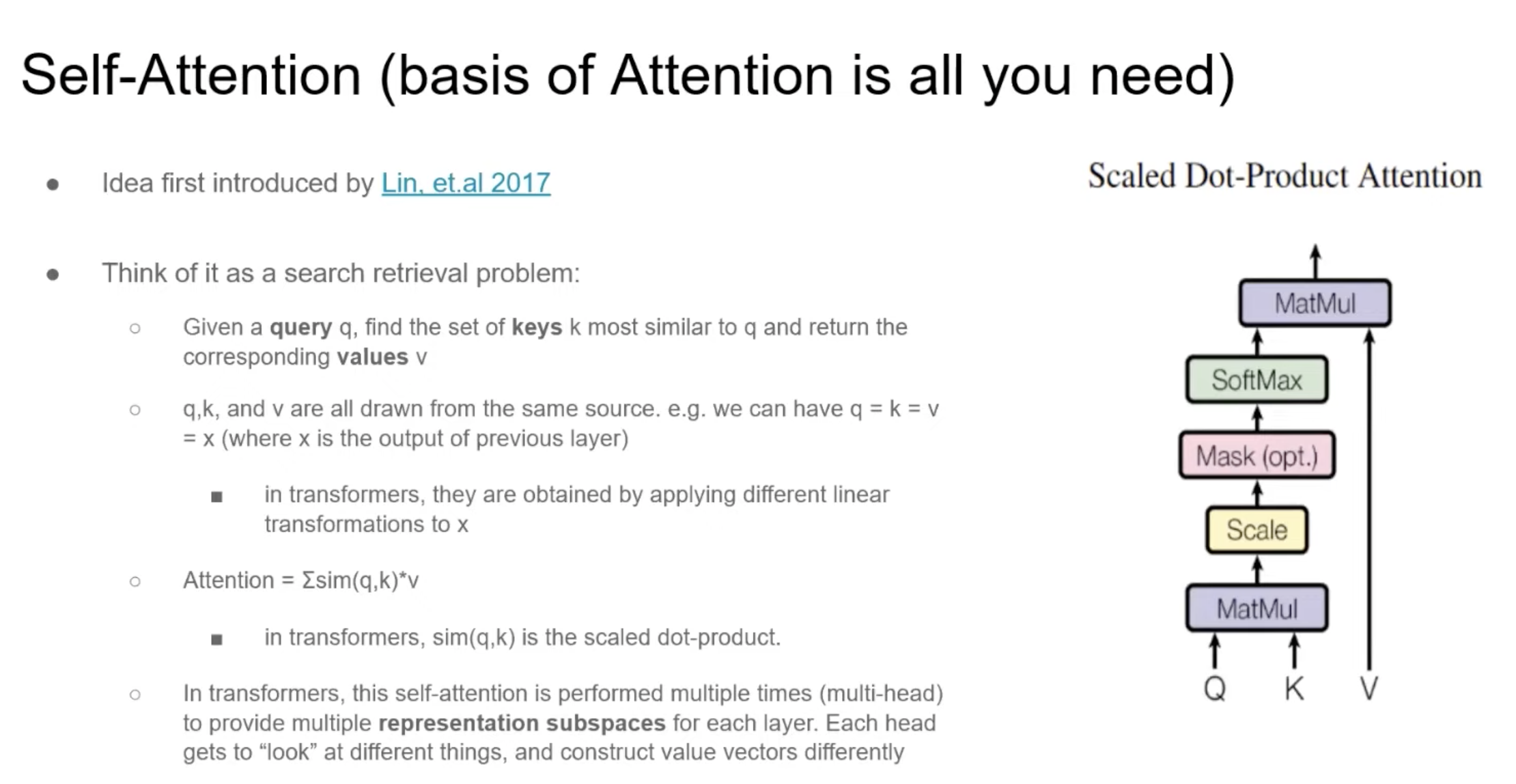 Query와 Key가 주어졌을 때, Query와 가장 닮은 Key를 따르는 value를 찾아야 한다. Self-attention에서는 이 key, query, value가 똑같은 문장에서부터 주어진다. self-attention을 통해서 model은 각 위치의 각 다른 token 사이에서 복잡한 interaction을 잡아낼 수 있게 된다. 어텐션 값이 계산되는 방법은 단지 weighted summation이다. 서로 연관있는 input 사이의 weight를 구하기 위해서 Transformer에서는 Scacled dot product를 similarity function으로 사용한다.