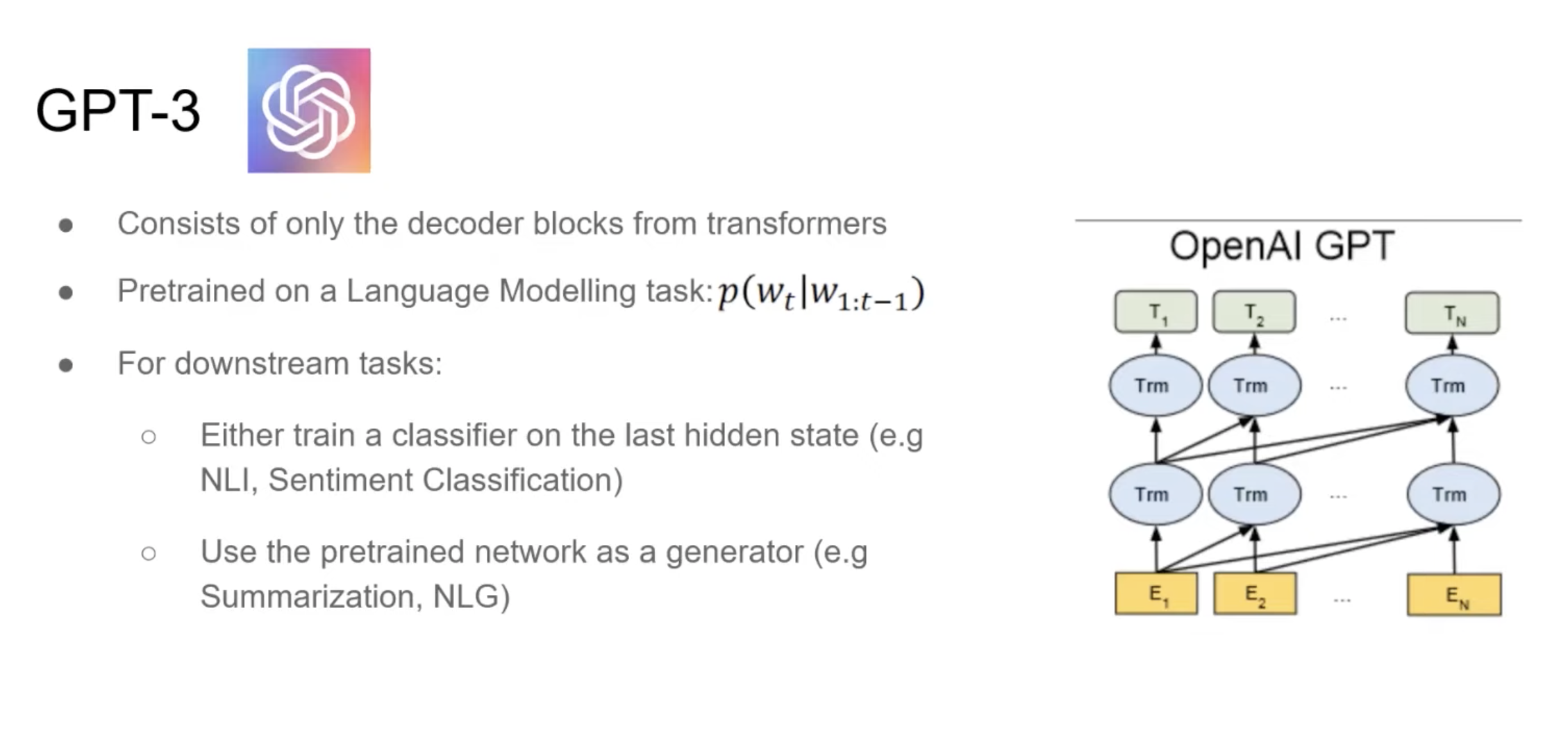 그리고 GPT3는 Open AI에서 나온 단방향 모델이고 이전 토큰들만 가지고 현재 State를 계산하는 language model로 이를 인코더로 사용하고 Sentiment classification, summeration, NLG 등의 downstream task를 위한 마지막 layer하나만 추가하는 식으로 사용할 수 있다. GPT3는 In-context learning을 통해서 downstream task에 대한 finetuning 없이도 여러 task를 수행 할 수 있다는 장점이 있다.