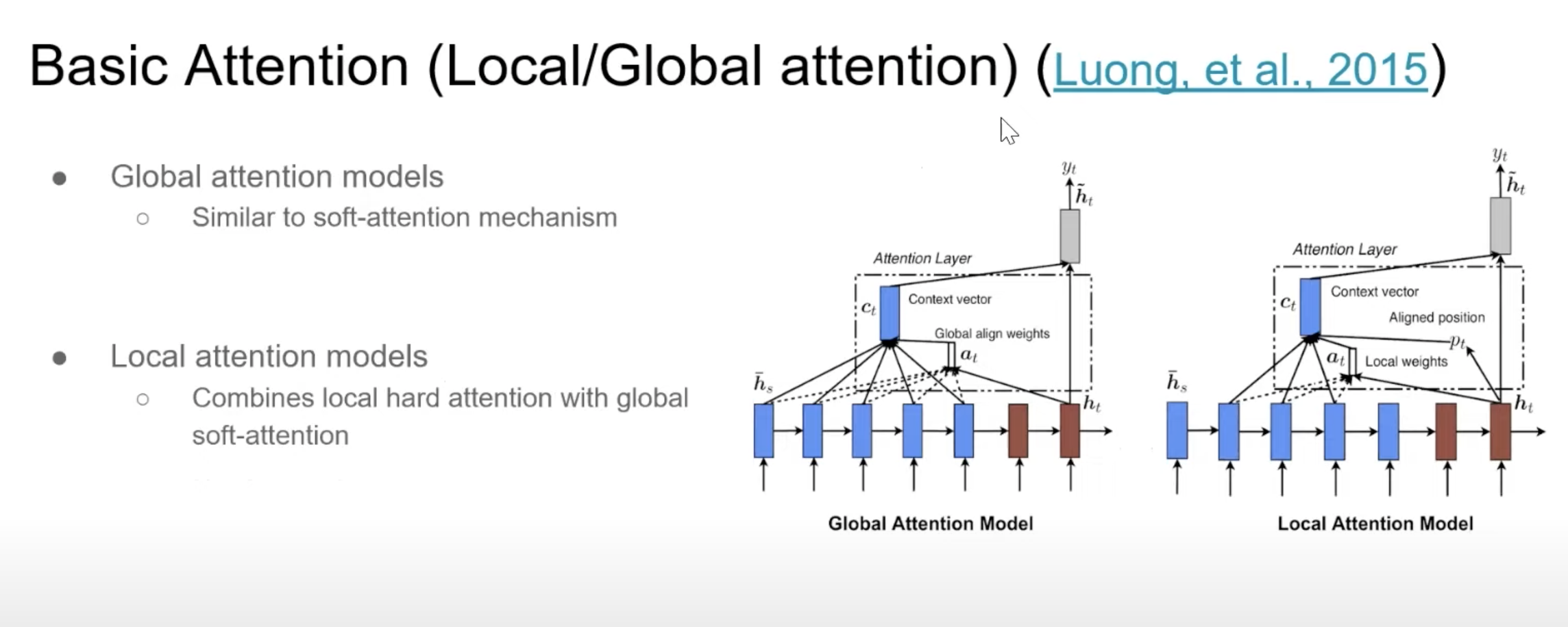 그리고 Self-attention 매커니즘이 제안되기 전에 있었던 기본적인 어텐션 매커니즘은 위와 같다. Global attention은 soft attention처럼 y_t를 얻기 위해 모든 hidden layer ouput을 attention layer에 반영하는 것이고 Local attention은 모든 이전 sequence의 attention을 계산하지 않고 더 작은 window의 hidden을 attention layer에 반영하는 것이다.