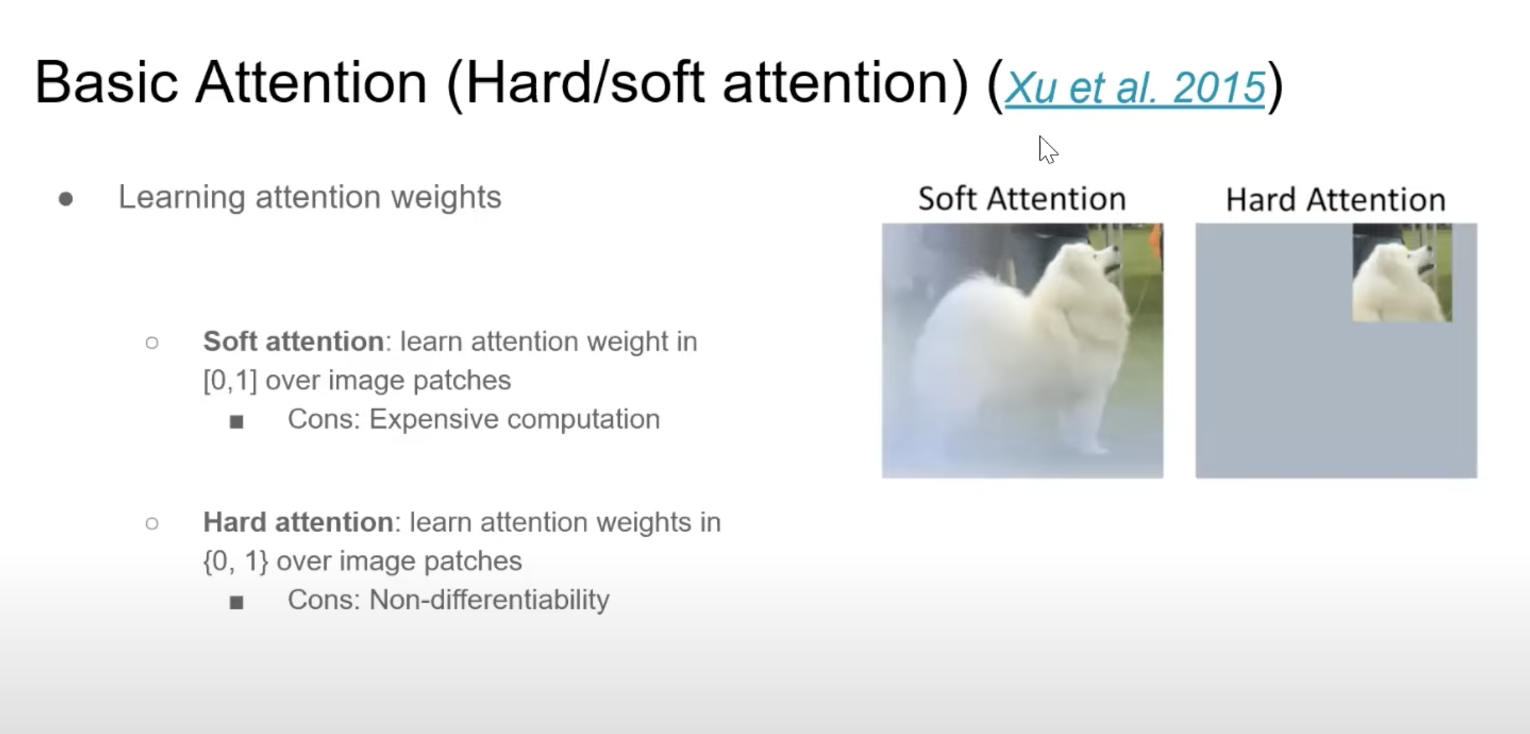 Attention Mechanisms은 중요한 부분의 가중치를 크게 주자는 Importance Weighting으로부터 영감을 받은 것이다. 사람은 위 사진이 강아지 사진임을 구별할 때, 강아지의 얼굴 부분을 보고 강아지 사진이라고 생각하지, 잔디 부분을 보고 강아지 사진이라고 구분하지 않는 다는 것이다. 이미지에서 엣지 같이 중요한 부분의 픽셀의 가중치는 크게하고 배경 같은 부분의 픽셀의 가중치는 작게한다는 간단해보이는 원리이다. Soft attention은 가중치를 0과 1 사이가 되고 hard attention은 중요한 부분은 1 아니면 0으로 극단적으로 선택하는 것을 말한다. soft attention은 computation cost가 높지만 전체적인 데이터의 correlation을 학습할 수 있고 hard attention은 compuatation cost는 적지만, Non-differentiable하다는 단점이 있다.