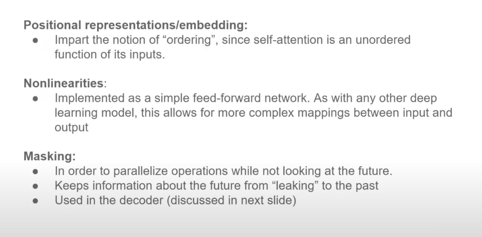 그리고 Self-attention 외에도 Transformer가 강력한 이유는 Positional 인코딩과 Nonlinearities, Masking등이 있다. Transformer는 병렬적으로 이전 Sequence들의 Attention 값을 계산하기 때문에 RNN과 달리 position 정보를 줄 수 없으며 이는 문장 데이터와 같이 순서가 중요한 데이터에는 치명적이다. 이를 해결하기 위해 positional encoding을 따로 수행하며, 복잡한 Input ouput 매핑을 가능하게 하는 Nonlinearity와 미래 Token을 보지 못하게 하는 masking 트릭을 통해 다음 토큰의 예측 능력을 크게 키웠다.