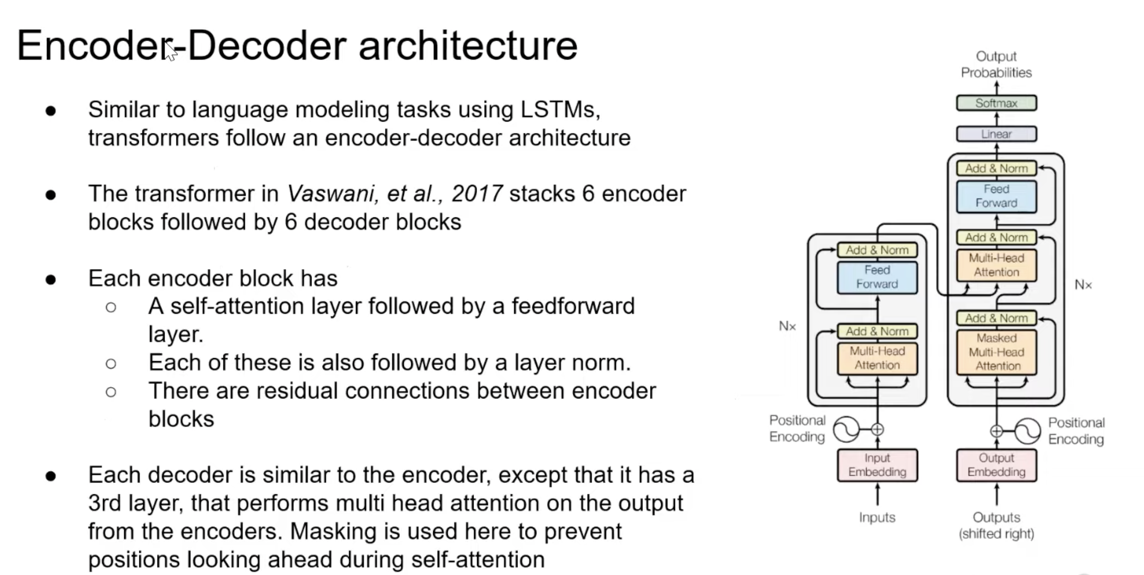 Self-attention layer에서 Linear operation을 통해 만들어진 encoding state와 ouput token이 매핑되기 위해서 위와 같이 Encoder-Decoder가 레고처럼 쌓인 것 같은 구조가 필요하다. 디코더는 인코더와 유사한 구조를 가지고 있지만 인코더의 이전 레이어를 받는다는 점이 다르다.