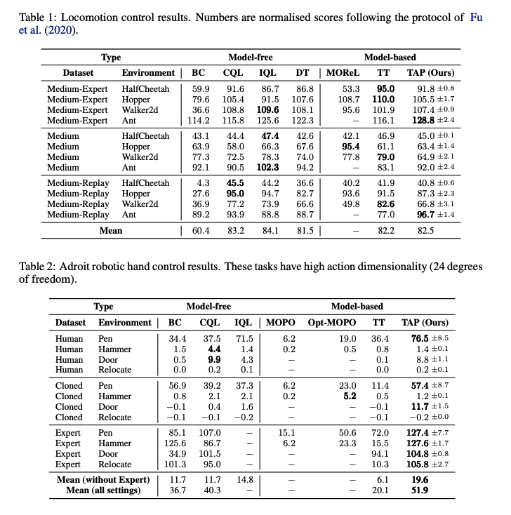 - offline RL setting에서 Empirical evaluation은 TAP가 효율적으로 high-dim continuous space에서 사용될 수 있고 기존 MB MF method를 능가하는 성능을 보여줌