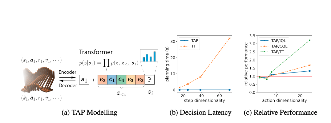 planning-based sequence modelling method는 continuous control 문제에서 좋은 결과를 보여주었지만(e.g. TT) 높은 complexity와 high-dim에서의 planning하는 것이 challenging하다. 그래서 TAP(Trajectory Autoencoding Planner)은 state를 conditioned하는 VQ-VAE(Vector Quantised Variational Autoencoder)를 사용해서 high state-action sequence를 scale한다. TAP는 현재 state가 주어졌을 때 trajectories의 conditional distributuion P(traj | s)를 모델링하며 step-by-step으로 planning(O(D^3) 하는 대신, optimal latent code sequence로 beam search를 하게 된다.(O(C))