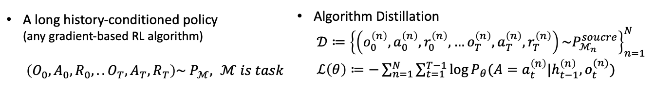 AD는 먼저 Any gradient-based RL algorithm으로 Task에 대한 history-conditoned policy를 학습한 후 이 Policy로 각 task에 대해 dataset D를 생성한다. 그런다음 source algorithm의 behavior를 Sequence model에 distillation한다. 이 Sequence model은 log history에 action prob을 mapping하며 NLL(negative log likelihood) loss를 사용한다.