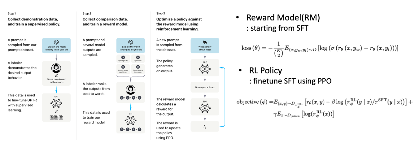 SFT GPT에서 내논 output 중 사람이 가장 선호하는 y와 나머지 k를 모두 이용하는 것이 아니라(overfitting 방지) single batch에 2개씩 뽑아 사용했다고 한다. Y_w에 사람이 선호하는 prob을 policy 모델에 할당하고 SFT model의 KL panelty를 줘서 reward model이 over optimization하는 것을 방지했고 PPO gradient와 Pretraining gradient를 섞어서 기존의 NLP task도 잘 수행할 수 있도록 했다고 한다.