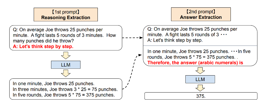구체적인 문제 풀이 과정의 예시를 제공하는 것을 few-shot prompt, 문제와 해답 템플릿만을 제공하는 것을 zero-shot prompt라고 하며, Few shot CoT 는 한개의 답을 단계별로 나눠서 예시를 주고(human engineering 왼쪽 그림) zero shot CoT(오른쪽 그림)은 문제에 대한 구체적 예시를 주지 않아도 되고 LLM이 답변한 추론 내용을 다시 Prompt로 주는 방법이다.