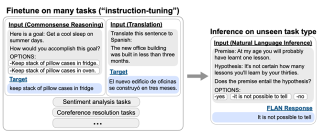 그리고 Instruction Tuning은 Instruction template를 정해 두고 기존 task데이터를 instruction에 맞게 수정한 뒤 tuning 에 포함되지 않은 task에서 evaluete하는 것이다. FLAN, FLAN-T5 등의 모델은 instruction tuning이 LM이 unseen task에 대한 zero-shot 성능을 향상 시킬 수 있음을 보여줬다. 해당 논문(HIR)에서 Base model로 사용한 모델이 FLAN-T5이다. FLAN-T5는 Instruction tuning에다가 CoT를 적용한 모델이다.