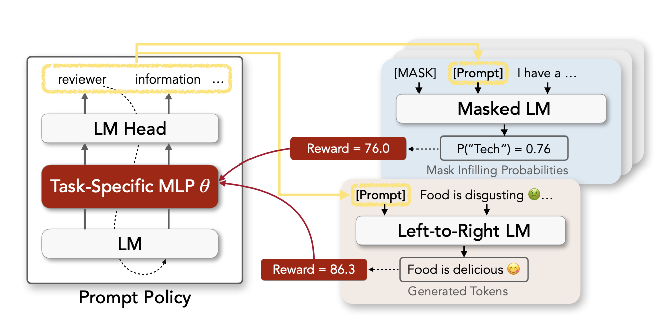 그리고 RLPrompt라는 것도 있는데 Discrete Prompt를 optimize하는데 RL이 적용되었고 Prompt generator가 RL의 Policy가 된다.