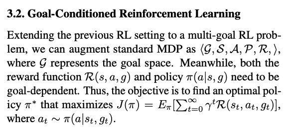 Goal-conditoned RL에서 MDP는 State, Transition prob, Action, Reward, Neat state로 이루어진 MDP에 goal G가 추가된다. 그리고 Reward function은 State S, Action A와 함께 Goal G도 Input으로 받는다. 그리고 policy는 State S, Goal g가 Conditioned된다.
