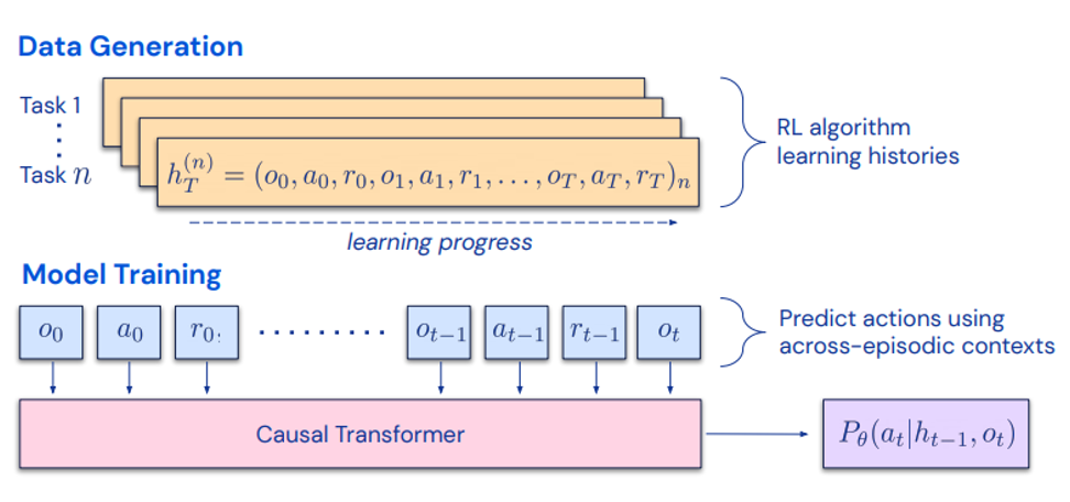 직관적으로 fixed parameter를 가진 Sequence model은 Source RL algorithm을 armotise해야하며 exploration, temporal credit assignment 등의 복잡한 behaviour를 나타낼 수 있어야 한다. RL policy는 source algorithm의 learning history를 통해 향상되고 정확한 action prediction을 위해서는 Sequence model이 이전 context에서 현재 policy를 추론할 뿐 아니라 개선된 policy도 추론해야 한다.