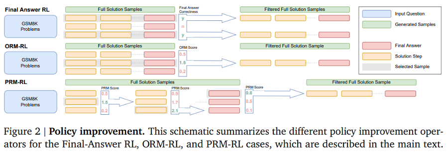 few shot prompting, supvervised FIne tuning, RL등으로 Policy가 미리 학습된 모델이 있을 때, model ouput score로 finetuning한 ORM, 마지막 대답만으로 Correctioness로 finetuning한 Final-Answer RL, 문제를 풀어가는 과정에서 각 step에서의 score가 맞았는지 가지고 fine tuning한 PRM-RL 위 세개를 비교했을 때 Final-Answer RL이 가장 좋았다고함. 이 논문은 자세히 읽어보지 않아서 모르지만 지금 소개하는 HIR에서는 Imitation Learning을 통해 alignment problem을 해결한 방법은 주로 정답이 맞은 데이터셋 혹은 높은 점수를 받는 데이터셋 만을 사용하는 경우가 많고 이는 Data inefficient하다고 말하고 있다. FARL는 실패한 케이스를 sampling하긴 하지만 성공한 케이스만 사용하게 된다.