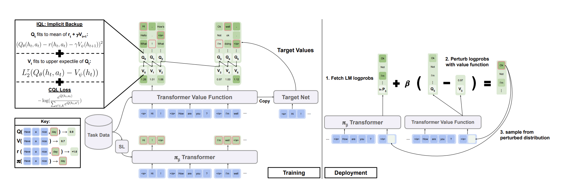 ILQL은 Dynamic programming방법을 기반으로 하며 Implicit dataset support 제약 조건과 함께 Value conservatism을 혼합한 방법이다. 이를 통해 Value function을 학습하고 LM generation을 utility가 maximizing되는 쪽으로 가이드하는데 사용된다.