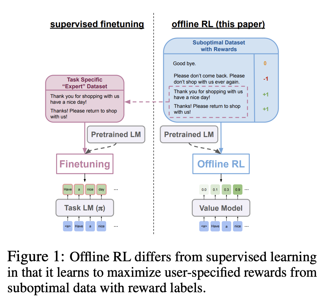 LLM(Large Language Model)은 User specified task를 완성시키는데는 일관성이 없을 수 있다. 이를 해결하기 위해 정확한 데이터로 Supervised finetuning하거나 RL로 finetuning하는 방법이 사용되었다. 이 논문에서 제안하는 ILQL은 novel offline RL 알고리즘을 활용해 전통적인 RL의 flexible utility optimization과 Simplicity, Stablility가 강점인 SL을 동시에 이용하여 Language model을 Finietuning하는 알고리즘을 제안한다.