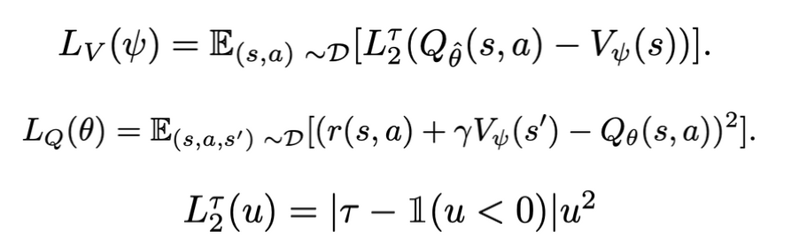 tau > 0.5라면 맞추고 싶은 expectile V, 즉 estimator가 target보다 크면 weight를 적게 준다. 이렇게 되면 Q를 데이터셋안에 있는 action 중 좋은 Q를 학습할 수 있게 된다. tau 0.5면 MSE이고(mean regression) tau=1이면 데이터셋에 있는 것 중 가장 좋은 Q를 학습할 수 있다. mean을 맞추는 것이 아니라 90% expectile을 맞출 수 있게 된다.