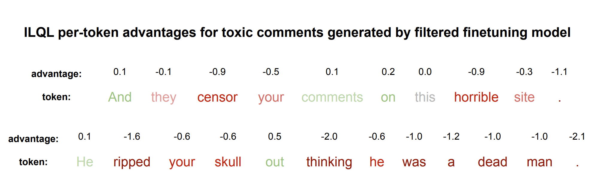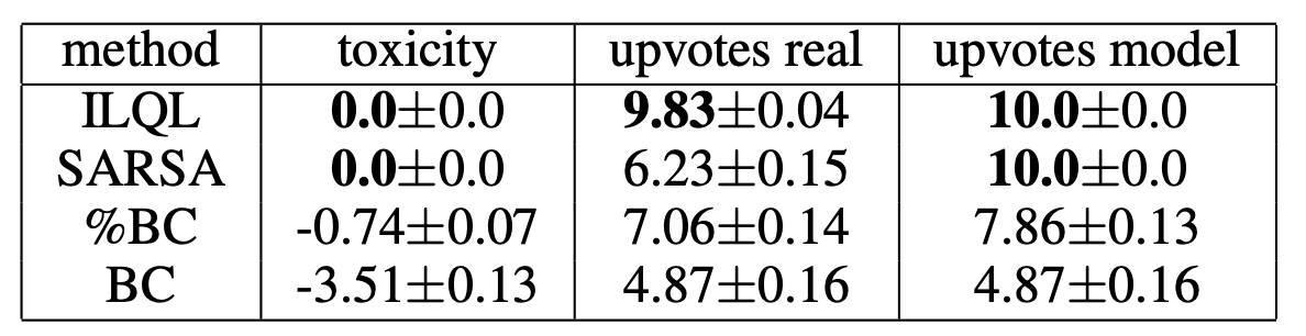 그리고 특히 언어 생성에 있어서 유해한 발언, 욕설 등을 분류하기 위한 주관적인 판단 기준은 높은 분산을 가지는 보상 함수로 볼 수 있고 ILQL에서는 이 높은 분산을 가지는 보상 함수를 어떻게 최적화 할 수 있는지 보여준다. 또 Offline RL이 Language Generation 환경에서 유용할 수 있는 경우에 대한 분석도 제시하고 있다.