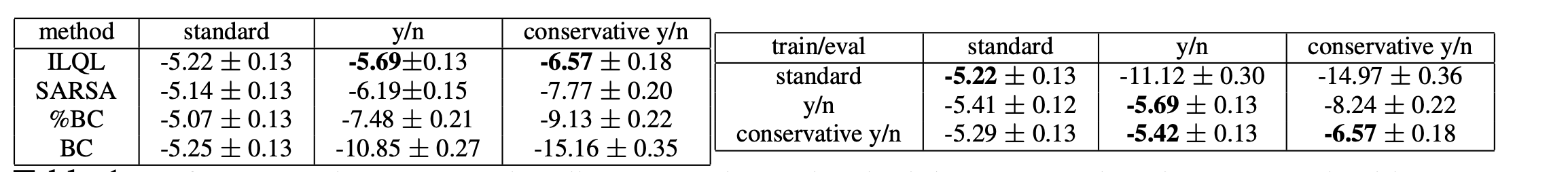 - ILQL의 많은 다양한 utility function에 일관적으로 좋은 성능을 보여주고, 이전 연구들보다 stable할 뿐 아니라 stochastic 하거나 subjective한 reward function을 optimize하는 독특한 능력을 보인다. 또한 ILQL의 sub-optimal하거나 일반적이지 않은 data distribution에 대해서도 optimal behavior을 발견하는 능력도 보인다.