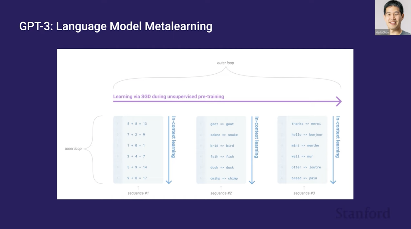 GPT3의 주요 인사이트는 In context learning으로 설명될 수 있다. 프롬프트가 무엇인지에 따라 task가 무엇인지 빠르게 판단하고 해당 작업에 적용하여 다음 토큰을 예측하게 된다. 학습 중, 모든 SGD 단계의 외부 루프와 task가 무엇인지 파악하고 다음 토큰을 모델링 하는 내부 루프가 있어 산술, 독해 등 더 복잡하고 많은 task를 수행할 수 있게 됬다.