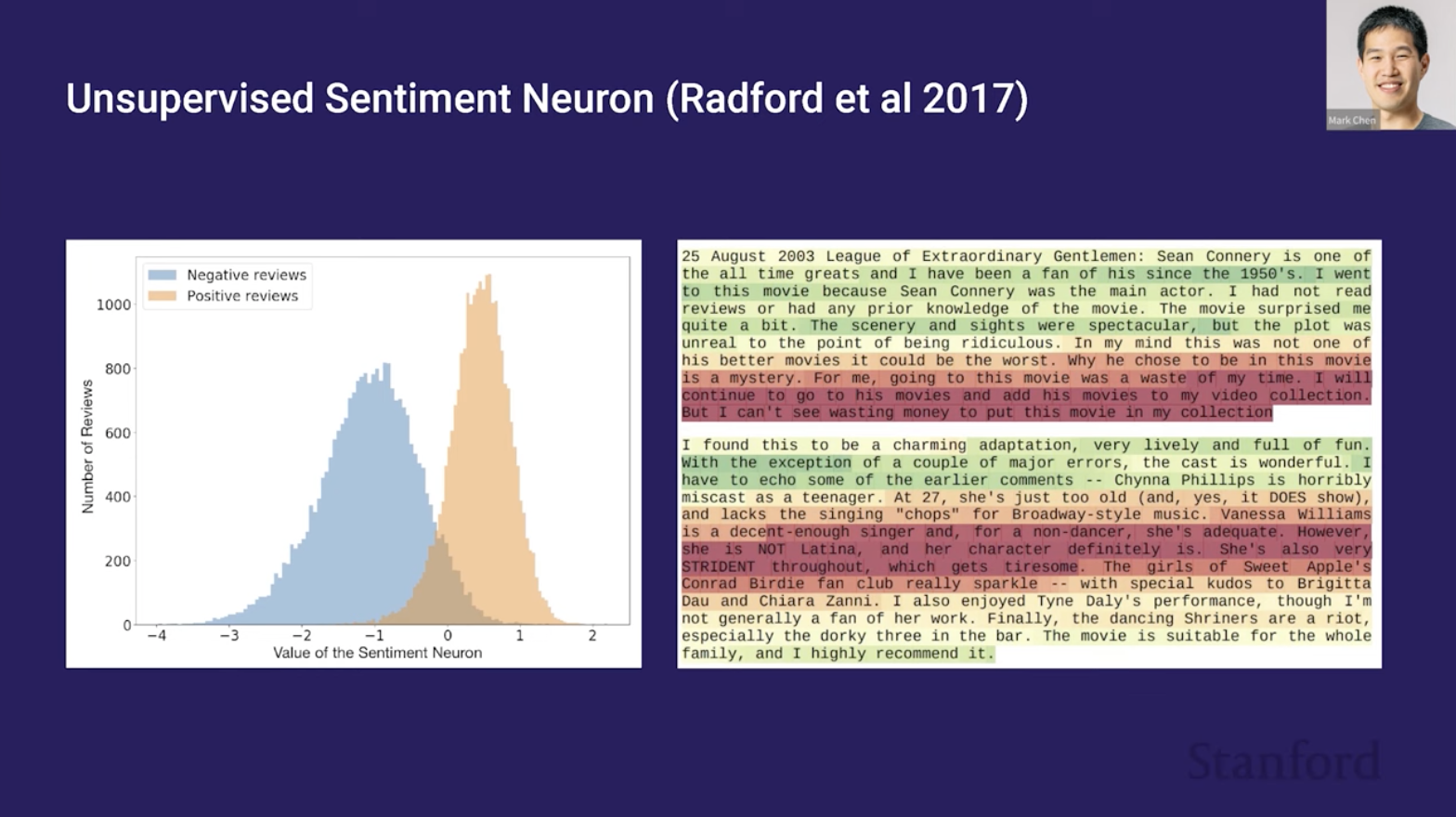 아마존 리뷰의 next token prediction으로 생성된 lstm feature로 linear model을 training하였을 때 놀라운 점을 발견했다. 레이블이없음에도 긍적적인 리뷰와 부정적인 리뷰에 대한 activation이 구별이 되었다. 그래서 다음 token을 예측하는 것 만으로도 하나의 뉴럴넷이 엄청난 예측력을 가질 수 있음을 알게 되었다.