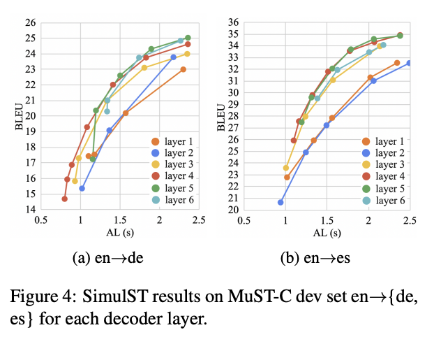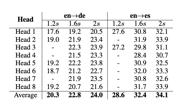 만약 가장 최신의 오디오 프레임만 attend 하지 않는다면, 현재까지 step에서 모인 information은 word를 emit하기에 충분할 것이라는 점을 이용한다. 그리고 논문에는 Encoder-Decoder attention score는 simulST task에서 ST model의 policy를 가이드하기 위해 이용될 수 있는 소스-타겟 관계를 대표한다는 것을 실험으로 보여주고, 다른 SimulST policy들과 비교해서 낮은 latency를 보여주며 최신 SimulST base model보다 뛰어난 성능을 보여주는 것을 입증한다.