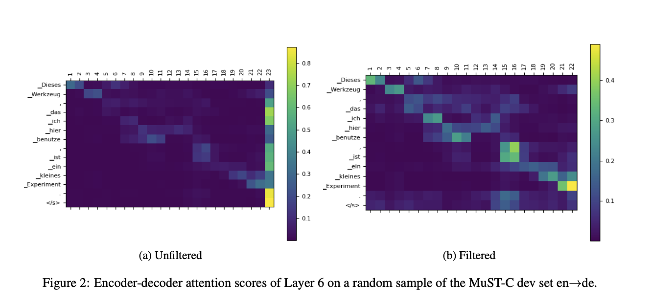 위와 같은 Attention pattern은 ST에서도 존재하는 것을 확인하기 위해 attention weight visualization하였고, 이전 연구들에서도 관찰되었다 싶이 약 97% attention score가 가장 최근의 source에 몰려있었다. 이를 해결 하기 위해 re normalization을 해서 (b)와 같이 pseudo-diagonal pattern을 만들어주었다고 한다.