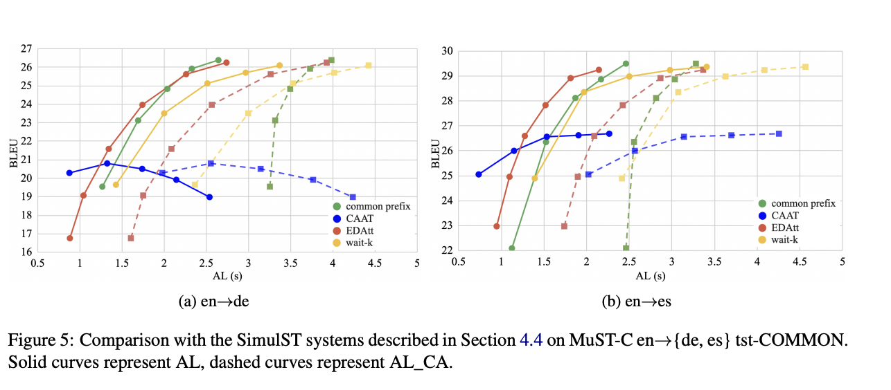 비교 Baseline으로는 SimulST task SOTA모델과 IWSLT2021 winning system인 Cross Attention Augmented Transformer(CAAT)이다. 그리고비교 policy로는 IWSLT2022 winning system의 common-prefix policy와 wait-k policy이다.