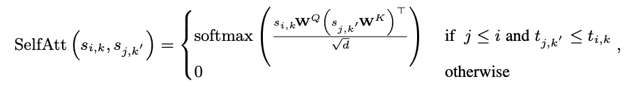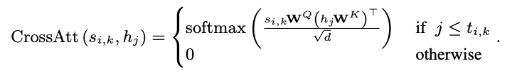 state s_{i, k}와 source hidden state h_j의 Cross Attention은 위와 같이 source hidden state step j가 source token t_{i,k}보다 작은 경우에 대한 attention을 계산한다.