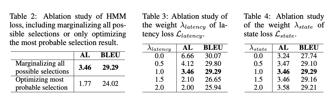 Table 2 HMM loss에서 z의 summation을 Max_z로 바꿔서 가장 선호하는 selection으로 optmizing하도록 바꾸었더니 모델이 local optimum에 빶지는 경향이 있었고 wait-3와 비슷한 성능을 주었다고 한다. 따라서 저자들은 HMT가 multiple possible moments로 부터 번역 시작점을 효과적으로 learning하기 위해서는 가장 선호하는 selection보다 가능한 selection의 marginalizing이 성능이 더 좋았음을 보여주었다.