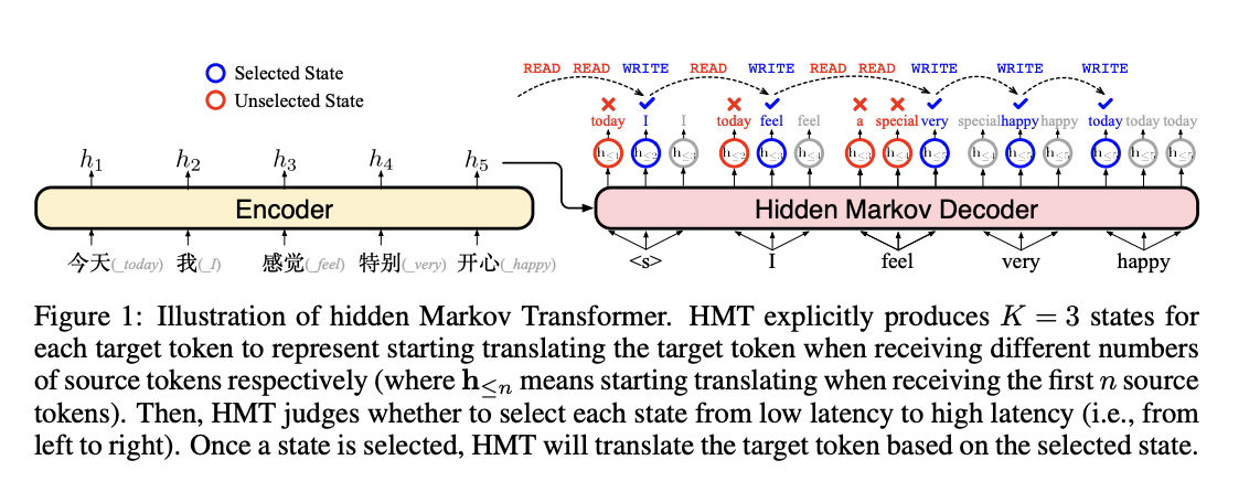위 Figure 1에서 볼 수 있듯이, HTM는 explicitly 각 타겟 토큰을 위한 states set을 만들어내고, 이 states set은 서로 다른 각각의 시점에서 타겟 토큰 번역 시작점을 표현하는 multiple states이다. 즉, 서로 다른 길이의 소스 토큰을 받은 후, 번역한 시점을 나타내며 그리고 HMT는 낮은 latency 부터 high latency까지 오는 각 state를 선택할지 말지 판단하게 된다. 그리고 일단 state가 선택되면 선택된 state에 근거해 target token을 생성하게 된다. 예를 들어서, 소스 토큰 갯수를 1, 2, 3을 받은 3개의 state가 있다고 할 때(각 state의 hidden은 누적), 첫번째 state가 선택되지 않고, 두번째 state가 선택되어 output "I"를 생성했으면 3번째 state는 더이상 고려되지 않는다. training동안 HTM는 모든 가능한 selected results(i.e. hidden events) 타겟 시퀀스의 marginal likelihoode를 maximizing하는 방향으로 optimizing된다. 이러한 방법으로 target token을 생성하는 states(moments)들은 더욱 정확하게 selected되고, HMT는 효과적으로 관찰된 target sequence의 supervision을 통해 언제 번역을 시작할지 learning하게 된다.