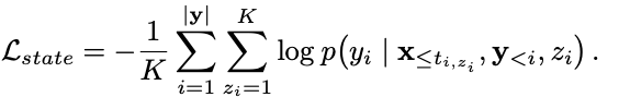그리고 어떤 State가 선택되어도 정확한 target token을 생성하여 모델의 robustness를 향상할 수 있는 state loss L_state를 추가로 사용하였다. K개의 states가 병렬적으로 hidden Markov Decoder로 feed되기 때문에 L_state는 모든 states에 대한 cross-entropy로 계산된다.