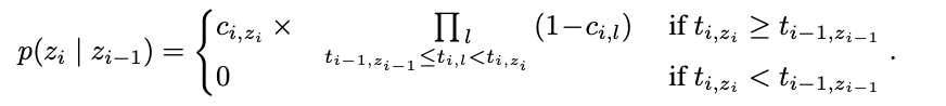 선택된 state를 z라고 하면 Transition probability는 이전 selection z_{i-1}이 condition된 selection z_i의 probability로 포현된다.(p(z_i | z_{i-1})) s_{i, k+1}은 오직 이전 state s_{i, k}가 선택도지 않았을 때만 선택될 수 있으므로 p(z_i| z_{i-1})을 계산하는 것은 2가지 파트로 나누어진다.