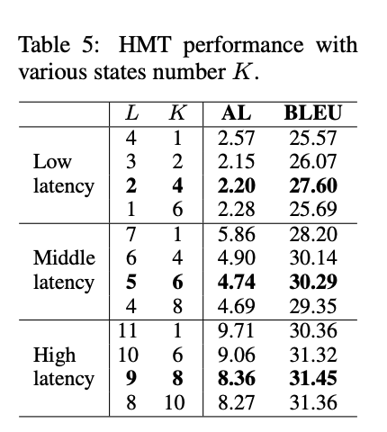 K가 작을 수록 낮은 latency에서 좋았으며 K가 커질 수록 latency가 커지는 경향을 보였다. 이는 translating moments의 큰 gap은 각기 다른 training동안 간섭을 일으키기 때문이며 이 gap은 low latency일 수록 더 두드러지게 관찰 되었다.