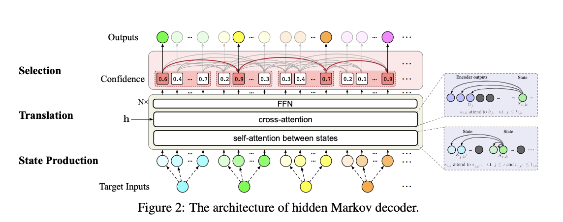 HMT는 encoder와 hidden Markov decoder로 구성되어 있으며, encoder는 unidirectional encoder를 사용하였다. encoder는 받은 source의 hidden state h를 생성하고, Markov decoder는 여러 시점에서 만들어진 target token y를 생성하기 위한 set of states를 만들어내고, 어떤 state가 선택될 것인지 결정하는 역할을 한다. HMT는 3개의 파트로 구성되어있고 각각 state production, translation, selection이다.