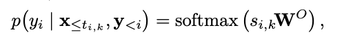 그리고 N개의 decoder layer를 통해 state s_{i, k}의 최종 representation을 얻고 이 final representation으로 부터 계산된 y_i의 prob을 얻는다. W^O는 W^Q, W^K와 마찬가지로 learnable parameter이고 y_{<i}는 이전에 얻어진 target tokens이다.