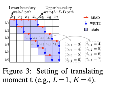 위그림처럼 wait-L path를 lower boundary로 정의하고 wait-(L+K-1)을 적절한 path의 upper boundary로 정의했으며 L과 K는 hyperparameter이다. Figure3에서 보면 L=1, K=4라면, y_1을 번역하려고 할 때 가능한 state set은 src token이 1부터 4인경우까지 총 4가지 set이 있는 것이다. lower boundary path는 소스 토큰이 1개씩 추가될 때마다 번역하는 것이고 upper boundary는 소스토큰 4개를 기다렸다가 1개씩 추가될 때마다 번역하는 것이다.