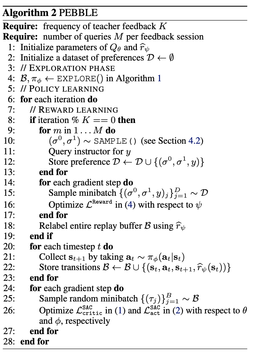 해당 논문에서 제안하는 방식을 사용하면, HiL learning을 통해 human effort의 양을 상당히 줄일 수 있다. 이를 위해 PEBBLE: unsupervised PrE-training and preference-Based learning via relaBeLing Experiences를 제안하고, PEBBLE은 supervisor가 제공하는 binary label(e.g. preference)로 보완되는 feedback-efficient RL 알고리즘이다. 그리고 특히 이는 unsupervised pretraining과 off-policy learning이 시너지를 낼 수 있다고 한다. generality를 위해 에이전트가 환경으로부터 보상을 받을 수 있다고 가정하지 않고, 에이전트가 경험을 다양하게 하고 일관된 행동을 생성하기 위해 intrinsic motivation만을 사용해 exploration을 하도록 한다. 다양한 경험을 수집하면 teacher는 의도하지 않은 방식으로 수집된 데이터에 대한 피드백에 비해 더 의미있는 피드백을 제공할 수 있다. 그런 다음, supervisor는 agent behavior clip pair 사이에 선호도를 표현하에 agent를 training한다. 에이전트는 이 정보를 reward model로 추출하고, RL을 사용해 추론된 보상 함수를 최적화한다.