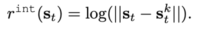 \hat{H}는 particle-based entropy estimator이고 s_i의 s_i^k는 k번째 이웃이다. 이는 state와 가까운 이웃 사이의 거리를 증가시키는 것을 의미한다. 이를 활용해 저자들은 intrinsic reward를 아래와 같이 정의했다.