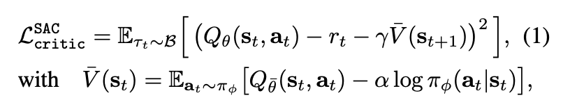 SAC는 off-policy actor-critic method로,exploration을 할 수 있게 하면서 policy entropy오 reward의 weighted objective를 maximizing함으로써 noise에 강건한 maximum entropy RL framework이다. SAC는 soft policy evaluation과 soft policy imporvement를 반복하며 파라미터를 업데이트하고, soft policy evaluation step에서는 아래 ovjective를 minimizing하는 soft Q function을 학습한다.