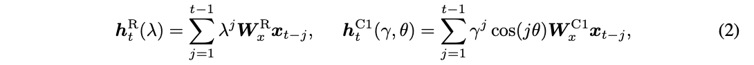 (2)식의 3가지 simple RNN은 서로 다른 temporal decay patterns를 제공한다. h_t^R은 real eigenbalue \gamma_k로부터 유도된 regular exponential decaly를 제공하고, {h_t^C1, h_t^C2}는 complex eigenvalue로부터 유도된 cyclical dampled cosine or sine decay를 제공한다. 이러한 temporal decay 패턴들은 regular REM, cyclical REM으로 나타내어질 수 있다. proposition 2에 의해, 이 3가지 타입의 패턴들의 cobination은 (1) 식의 RNN layer의 recurrent dynamics를 형성할 수 있다.