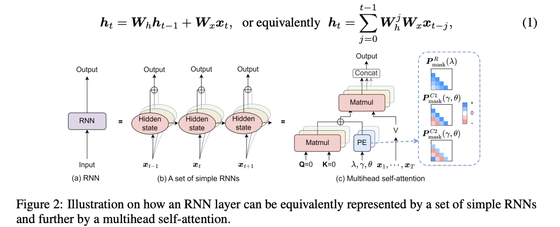 저자들은 linear activation을 가진 RNN layer는 scalar hidden coefficient를 가진 simple RNN의 시리즈로 쪼개질 수 있다는 점을 발견했다. 각 simple RNN은 distinct recurrent pattern과 simple RNN들의 cobination forms the recurrent dynamics of RNN layer를 유도할 수 있다. 그리고 이는 multihead self attention의 positional encoding과 같음을 보일 수 있다. 이를 사용해서 병렬 연산을 유지하면서, RNN과 self attention을 하나의 연산으로 합치는 솔루션인 Self-Attention with Recurrence(RSA)가 자연스럽게 탄생했다.