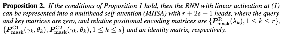 그리고 Proposition 1의 condition을 만족하면, linear activation을 가진 RNN은 키와 쿼리가 0 행렬일 때, head가 r+2s+1개인 multihead self attention으로 표현될 수 있고 relative positional encoding matrices는 각각 P^R_mask(\lambda_k), {P^C1_mask(\gamma_k, \theta_k, P_mask^C2(\gamma_k, \theta_k)}, identity matrix가 된다.