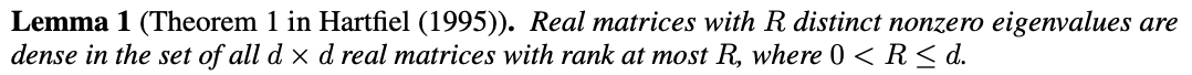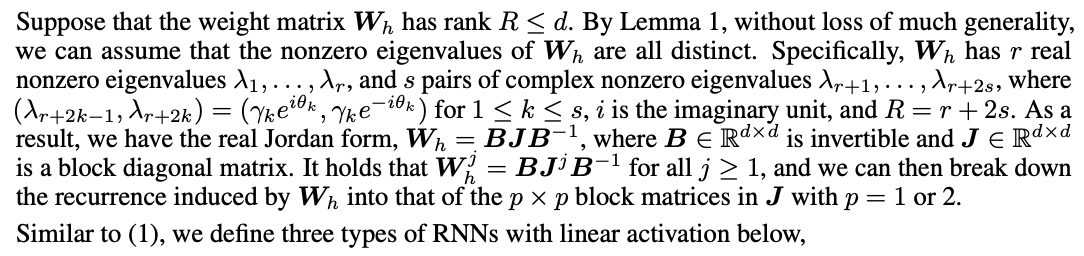 weight matrix W_h가 d보다 작은 R 랭크를 가진다고 가정하면, Lemma 1에 의해, 일반화를 많이 잃지 않고 우리는 W_h의 nonzero eigenvalues는 모두 distinct하다고 가정할 수 있다. 특히 W_h는 r real nonzero eigen value \lambda_1, .. lambda_r을 가지고, s pair의 nonzero 복소수 eigenvalue \lambda_r+1, \lambda_r+2s를 가진다. 그 결과 우리는 W_h를 real Jordan form으로 바꿀 수 있다. W_h=BJB^-1 여기서 B는 d*d invertible 행렬이고 J는 d*d block diagonal matrix이다. 그리고 이는 j가 1보다 큰 모든 j에 대해 만족하며 우리는 W_h에 의해 유도된 recurrence를 p*p block matrices in J(p=1 or 2)로 분해할 수 있다.