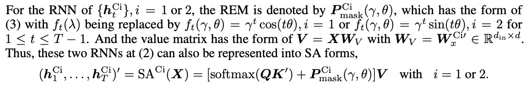 그리고 recurrent weight가 (\gamma, \theta)일 때 h_t^Ci는 위 형태로 표현할 수 있게 된다. 그리고 그 중 남은 텀 h_0,t는 오직 x_t에만 의존하므로 inter-depencence가 없다. 수학적으로 이를 identity realitive positonal encoding matrix를 사용해 Self Attention 형태로 나타낼 수 있게 된다. 마지막으로 위 reformulation에서 모든 쿼리, 키 행렬 Q와 K는 0으로 설정된다.
