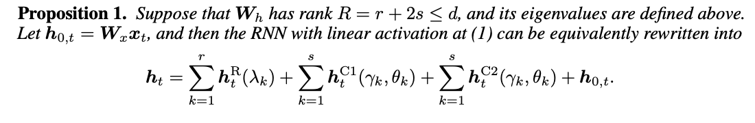 따라서 rank R이 d보다 작은 W_h는 RNN이 linear activation을 가질 때 식(1)을 위 수식처럼 다시 쓸 수 있게 된다.