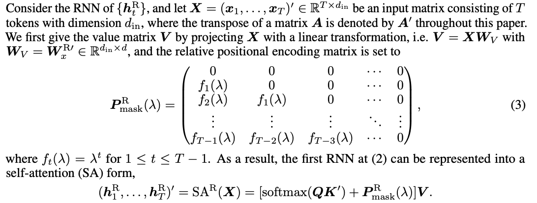 d_in의 차원을 가진 T개의 토큰을 포함하는 input matrix X와 h_t^R의 RNN, matrix A의 transpose matrix A'이 있을 때, 선형변환으로 X를 project한 value matrix V(=XW_V)를 먼저 계산하면 relative positional encoding matrix는 식 (3)처럼 표현할 수 있다. 그 결과로 식 (2)의 RNN 중 recurrent weight가 \lambda인 경우 h_t^R(\gamma)를 Self attention 형태로 표현할 수 있게 된다.