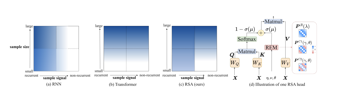 Sequential data는 대게 recurrent pattern을 가지고 있고 이는 REM으로 포착할 수 있게 된다. 반면 그 외 non-recurrent pattern은 일반 트랜스포머의 softmax(QK')을 통해 모델링할 수 있다. REM은 positional encoding과 상호보완적이고, 이는 relative location information도 제공할 수 있다. multiheadd RSA에서는 gate-control parameter mu는 오직 레이어에 따라 달라지는 반면 행렬 P를 제어하는 파라니터는 모든 헤드와 레이어에 따라서 달라진다.