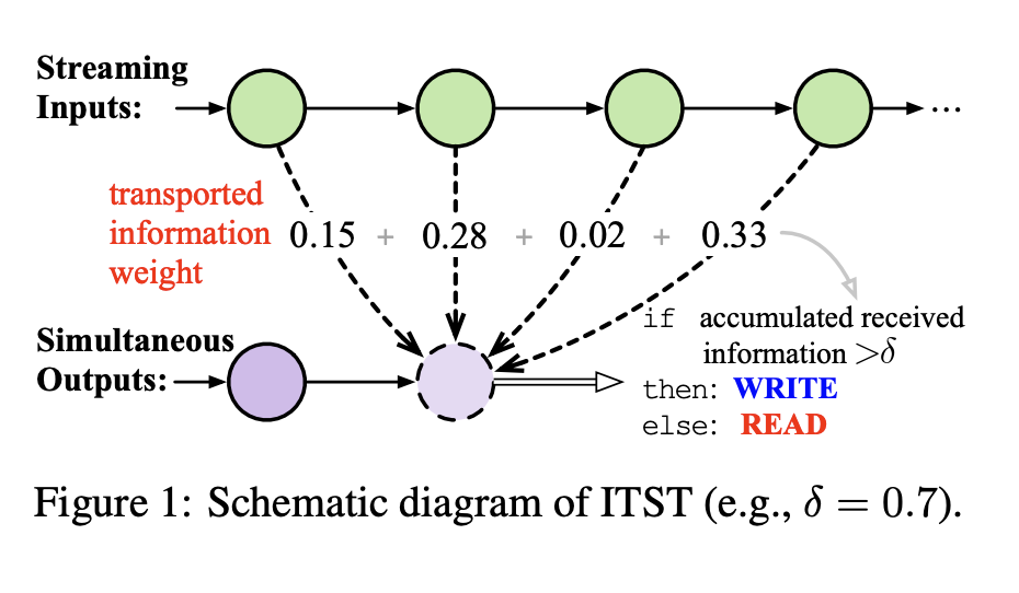 ITST는 명시적으로 현재 생성된 타겟 토큰을 projected한 소스의 정보를 명시적으로 measure하며, ST process를 하는 동안 ITST는 각 소스토큰에서 타겟토큰으로 전송되는 정보의 양인 information transport를 모델링한다. 그런다음, ITST는 지금까지 받은 누적 정보가 충분하다고 판단하면 번역을 시작한다.