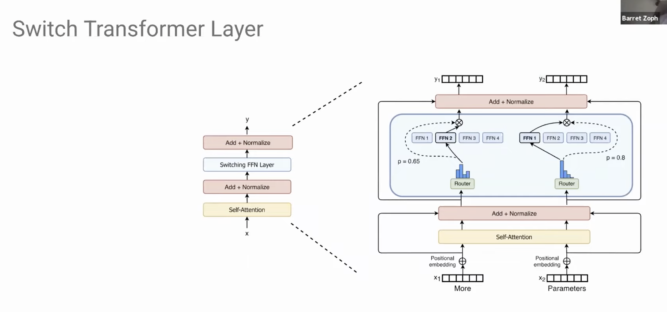 하나의 FFN 레이어는 expert가 되고, 라우터는 모든 expert에 대한 분포를 얻는다. 가장 간단한 아이디어는 가장 높은 확률을 가지는 expert를 보내는 것이고, 따라서 그림에서 보면 왼쪽 토큰은 2번째 FFN, 오른쪽 토큰은 1번째 FFN의 확률을 보내는 것을 볼 수 있다. sparse switch layer는 입력이 동일해도 서로 다른 weight matrix를 가지고 있다.