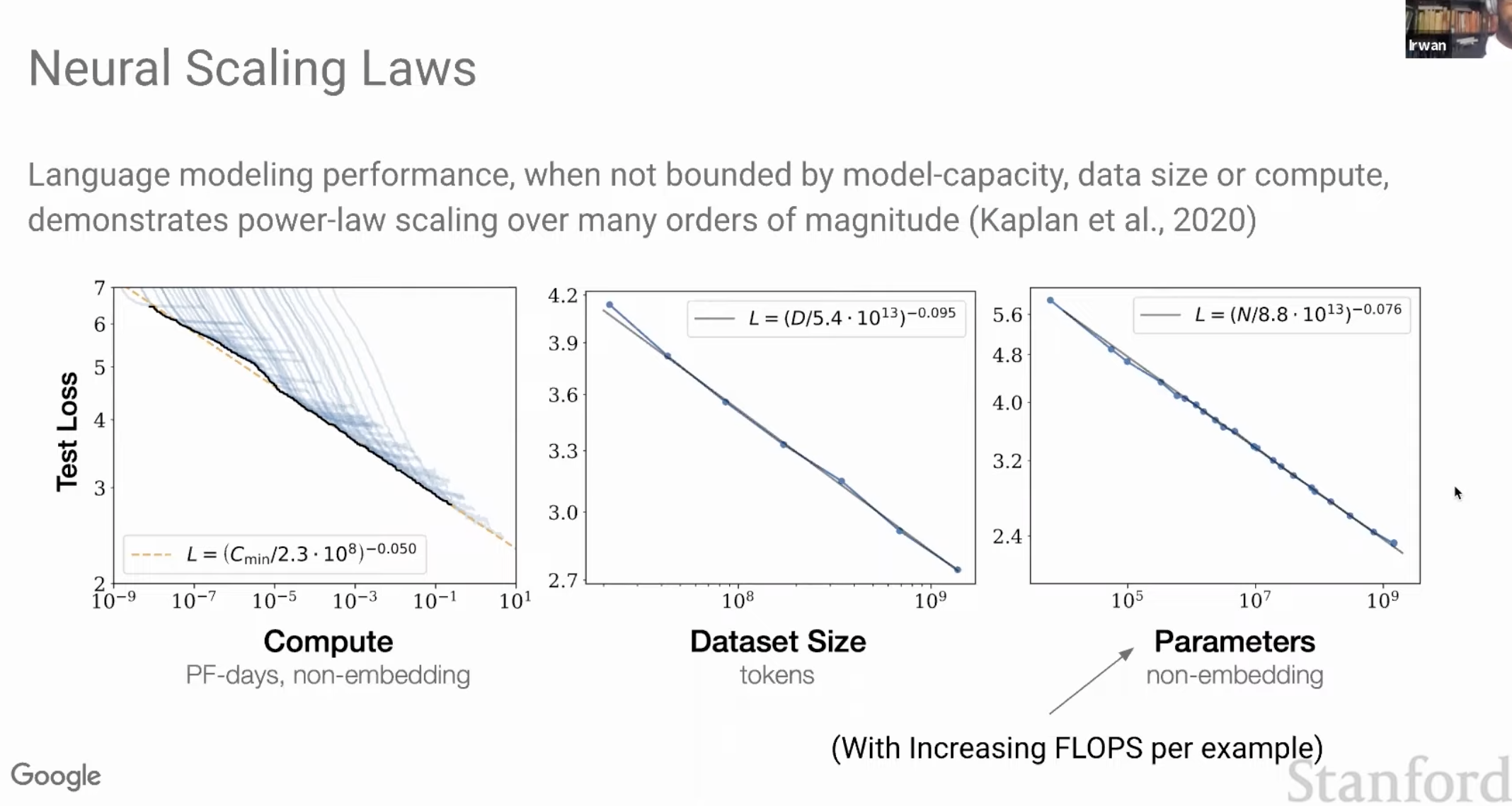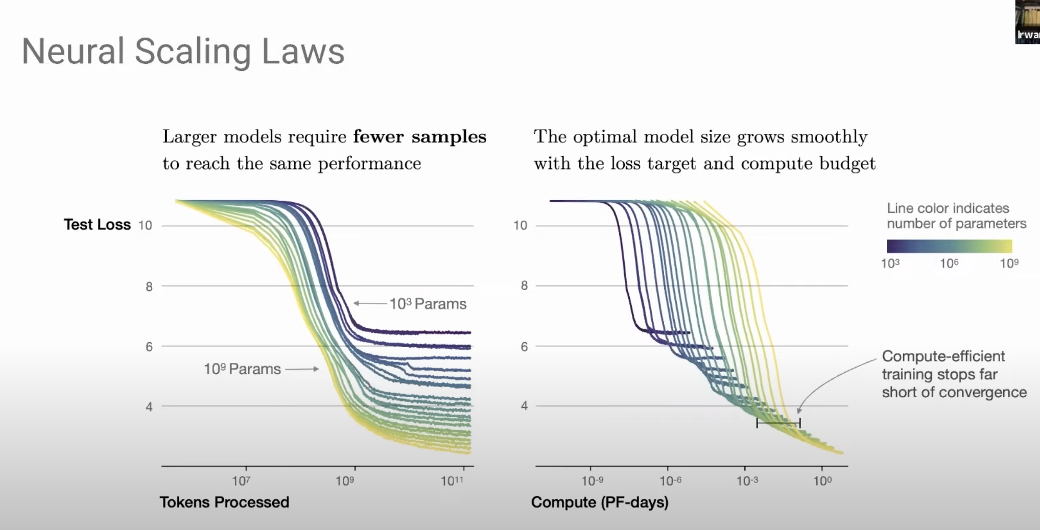 2020년에 OpenAI가 발표한 "Scaling Laws for Neural Language Model"에 대해 소개하면서, 딥러닝 분야에서 강력한 성능을 얻기 위해서 집중해야할 방식 중 하나가 'Scaling'이라고 이야기 한다. 해당 논문에서는 모델 성능이 컴퓨팅 또는 파라미터 측면에서 모델 크기와 평행하게 올라가는 것을 실험적으로 입증한 논문이며 큰 파장을 불러 일으킨 논문이기도 하며, 이 논문으로 대형 연구실에서는 모델의 사이즈를 늘리기 위한 경쟁이 이뤄지고 있다.